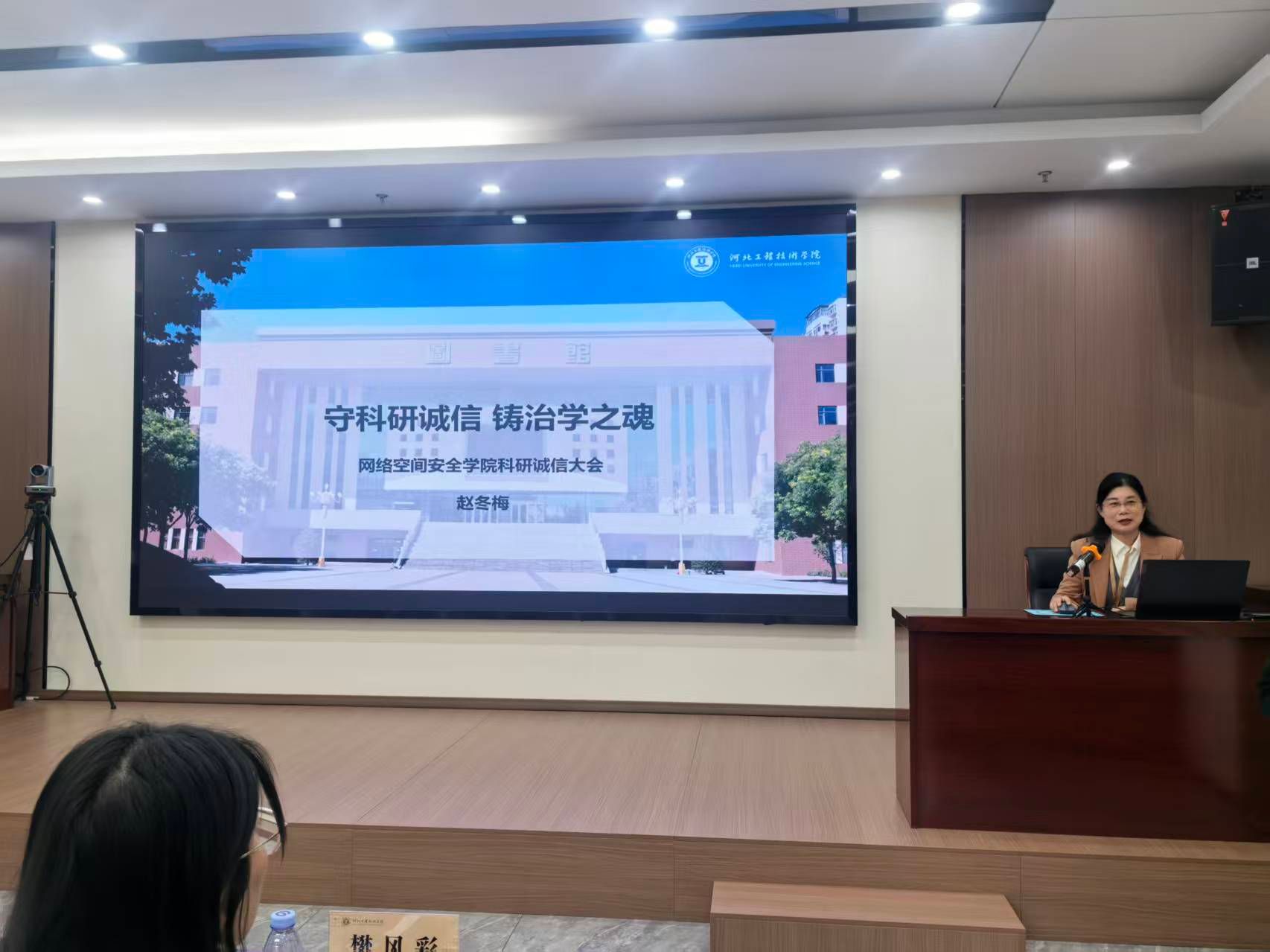 为进一步加强学院科研诚信建设,规范学术行为,营造风清气正的科研环境,2025年11月21日下午,网络空间安全学院在图书馆第一会议室隆重召开“坚守科研诚信,筑牢学术根基”科研诚信大会。科研与产教融合处处长王素贞教授、学院院长赵冬梅教授、学院党总支书记兼学管副院长樊风彩、学院教学副院长冯丽佳出席会议,学院全体教师参会。