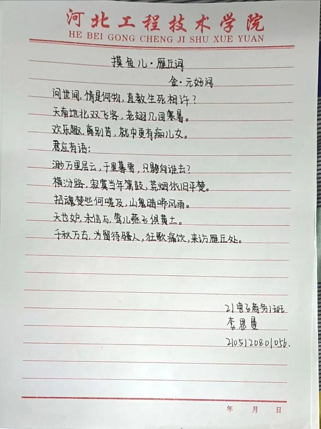 为了丰富同学们的校园文化生活,营造浓厚的古诗文学习氛围。进一步落实新课程标准中关于弘扬民族文化精髓的政策,增加学生经典文化底蕴。特此,河北工程技术学院软件学院于2022年4月29日晚自习开展“经典古诗文”抄写活动。