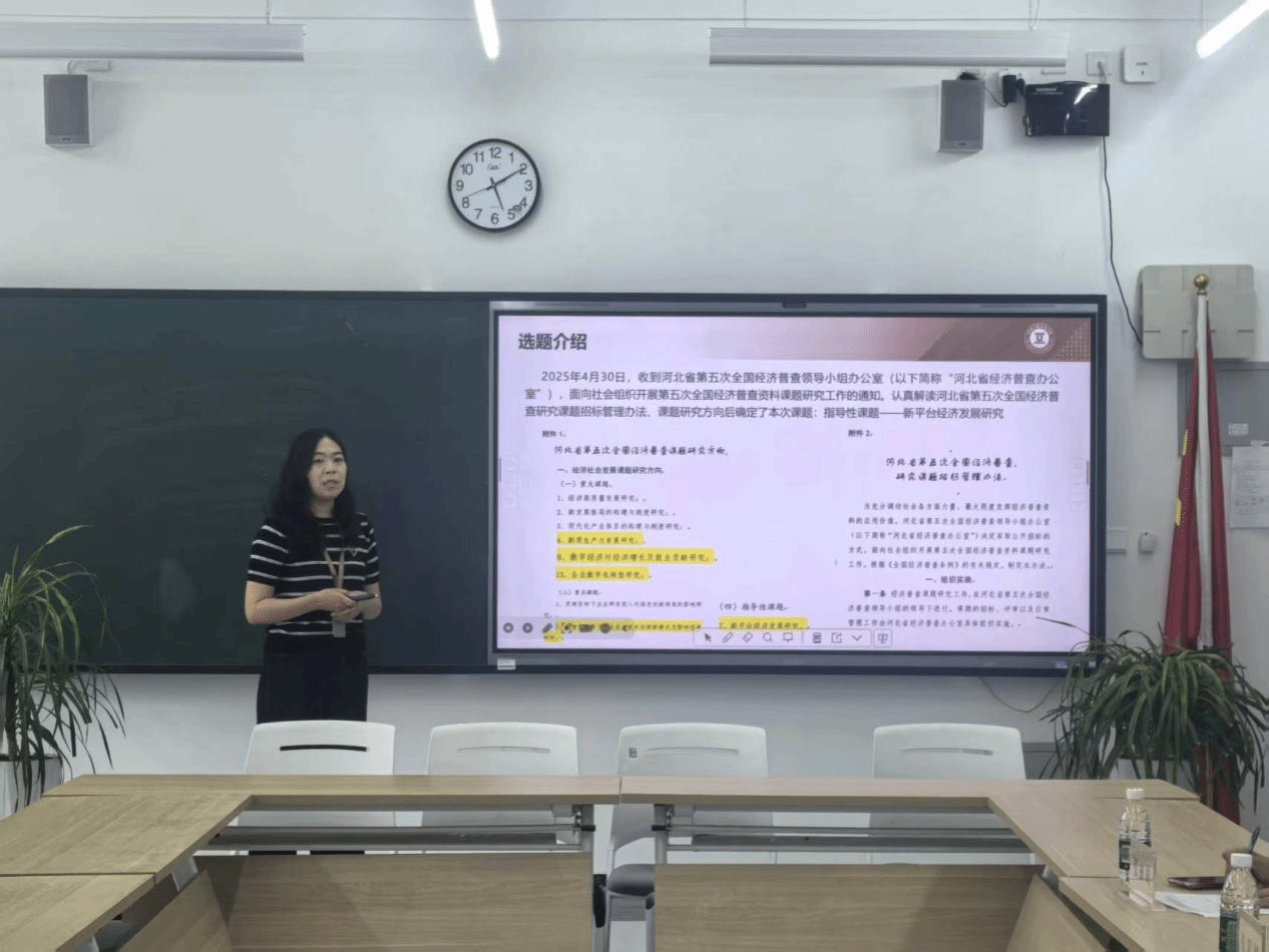 2025年7月1日下午2:30,河北工程技术学院网络空间安全学院在学院会议室7-208召开河北省第五次全国经济普查研究课题开题论证会。本次会议聚焦韩冰老师主持的《数智赋能新平台经济生态系统的构建路径研究》课题,旨在通过专家论证提升课题研究质量,为河北省经济普查成果转化提供智力支持。