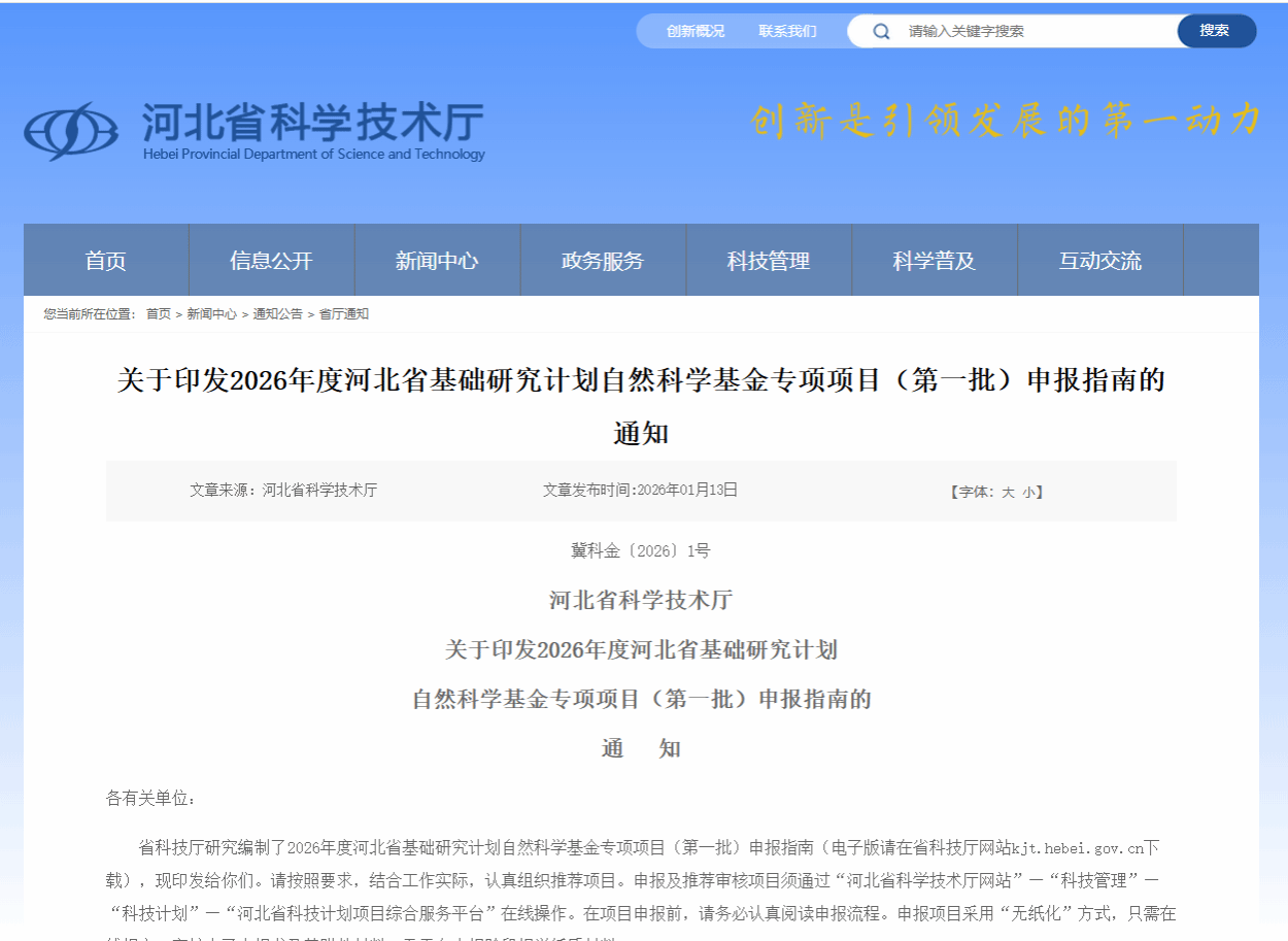近日,河北省科学技术厅印发了《2026 年度河北省基础研究计划自然科学基金专项项目(第一批)申报指南》(冀科金〔2026〕1 号),正式启动本年度项目申报工作。为做好我院项目申报的组织与推荐工作,现将有关事项通知如下: